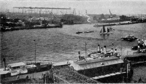 Dormols stünn noch de groten Helgen. Vornan kanns ok noch sehn, wat in Hamborg för Raddampers op de Ilv fohrt sünn. | ![]() Damals waren noch die großen Helgen der berühmten Werft zu sehen. Im Vordergrund einige Raddampfer. |